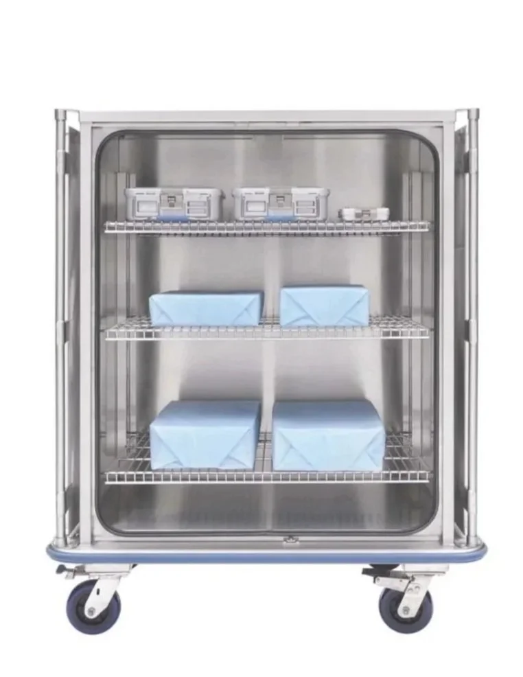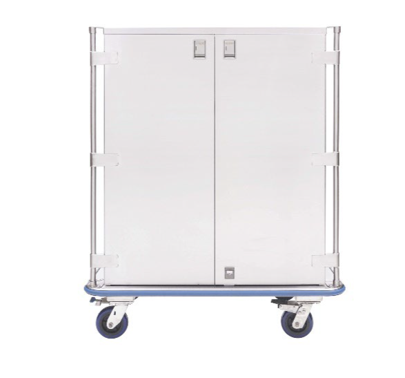 Double-walled, channel-enforced, welded, double-hinged stainless steel doors that swing 270 degrees.